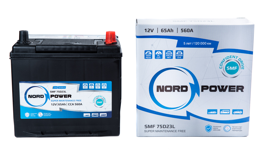 —Аккумулятор NORD POWER SMF 75D23L 65A/h (пусковой ток 560А)