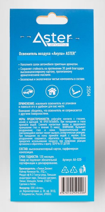Ароматизатор подвесной «Акула» (Пляжная вечеринка) ASTER, AA-020-SB   Освежитель воздуха подвесной «Акула» ASTER Наполните салон автомобиля приятным ароматом. Сохраняет стойкость на протяжении 30 дней благодаря высококапиллярному картону, пропитанному ароматическими маслами. Безопасные и экологически чистые компоненты в составе.