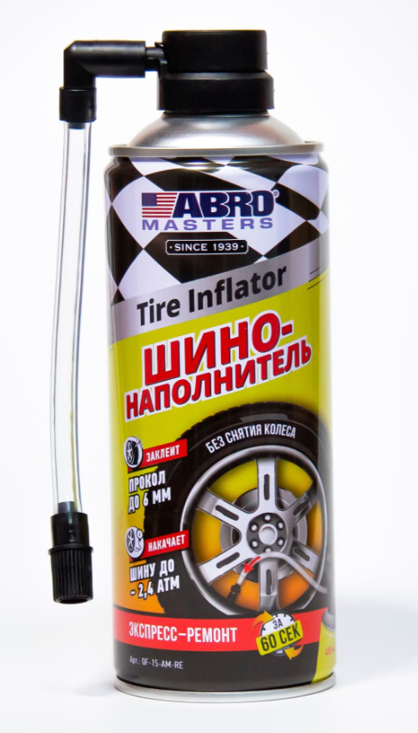 Шинонаполнитель ABRO MASTERS 450мл. Шинонаполнитель в баллоне для экстренного ремонта шин. Сфера применения: Предназначен для быстрого ремонта и накачки проколотых шин. Свойства: • Заклеивает большинство проколов до 6 мм и накачивает колесо за минуту. • Легок в использовании: не требует демонтажа и наличия специальных инструментов. • Подходит для использования на легковых и небольших грузовых автомобилях. • Не влияет на балансировку колеса. • Позволяет накачать шину до 240 кПа (2,4 атм). • Может использоваться для камерных и бескамерных шин. Применение: 1. Для достижения лучшего результата поверните колесо так, чтобы прокол находился снизу. 2. Хорошо встряхивайте баллон в течение 30 секунд. При отрицательных температурах предварительно нагрейте баллон. Не используйте для нагрева открытое пламя! 3. Снимите крышку, разверните шланг и плотно навинтите его на ниппель по часовой стрелке. 4. Зафиксируйте баллон в вертикальном положении и нажмите на кнопку. Удерживайте, пока из баллона не выйдет вся пена. Чтобы предотвратить поломку шланга, не встряхивайте баллон, пока шланг подсоединен к ниппелю. Отсоедините баллон. 5. Убедитесь, что обод колеса приподнялся от земли. Чтобы шинонаполнитель распределился по всему объему шины, необходимо проехать 3−5 км на небольшой скорости. 6. Проверьте давление в колесе и при необходимости доведите его до нормы. 7. Отремонтируйте шины у специалистов в течение 3 дней или 160 км (в зависимости от того, что наступит раньше). Состав: Деионизированная вода, стирол-бутадиеновый полимер, этиленгликоль, гидроксид аммония, целит, сжиженный углеводородный газ. Меры предосторожности: Пары раздражают глаза и дыхательные пути. Пары могут вызвать вспышку или взрыв. Попадание в глаза может вызывать раздражение, боль, слезотечение, покраснение, опухание, покалывание и/или ощущение песка в глазах. Продолжительный или повторяющийся контакт с кожей может вызвать ее сухость и обезжиривание, что может привести к раздражению и дерматиту (сыпи). Избыточное вдыхание паров или попадание на кожу могут привести к головной боли, головокружению, тошноте, падению кровяного давления, изменению сердечного ритма и цианозу. Продолжительное вдыхание может быть вредным. Может быть опасно или смертельно при проглатывании. Едкое вещество, может нанести серьезный и необратимый вред слизистой рта, горла, желудка. Избыточное воздействие может вызвать повреждение нервной системы, легких, почек. Не нагревать выше 50 °C. Храните плотно закрытый баллон в прохладном, хорошо вентилируемом месте, вдали от прямых солнечных лучей. БЕРЕЧЬ ОТ ДЕТЕЙ.