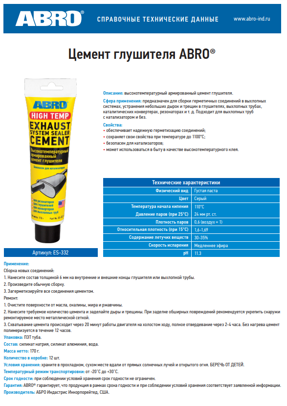 Цемент глушителя 170гр тюбик ES-332 ABRO Описание: высокотемпературный армированный цемент глушителя. Сфера применения: предназначен для сборки герметичных соединений в выхлопных системах, устранения небольших дырок и трещин в глушителях, выхлопных трубах, каталитических конвертерах, резонаторах и т. д. Подходит для выхлопных труб с катализатором и без. Свойства:  • обеспечивает надежную герметизацию соединений; • сохраняет свои свойства при температуре до 1100°С; • безопасен для катализаторов; • может использоваться в быту в качестве высокотемпературного клея. Применение Сборка новых соединений: 1. Нанесите состав толщиной 6 мм на внутренние и внешние концы глушителя или выхлопной трубы. 2. Произведите обычную сборку. 3. Загерметизируйте все соединения цементом. Ремонт: 1. Очистите поверхности от масла, окалины, жира и ржавчины. 2. Нанесите требуемое количество цемента и заделайте дыры и трещины. При заделке обширных повреждений рекомендуется укрепить снаружи ремонтируемое место металлической сеткой. Схватывание цемента происходит через 20 минут работы двигателя на холостом ходу, полное отвердевание через 2-4 часа. Без нагрева цемент полимеризуется в течение 12 часов. Состав: силикат натрия, вода, силикат алюминия. Меры предосторожности Оказывает раздражающее действие! Избегайте попадания в глаза и продолжительного воздействия на кожу. В случае попадания в глаза или на кожу, тщательно промойте водой. В случае проглатывания, обратитесь к врачу. БЕРЕЧЬ ОТ ДЕТЕЙ!