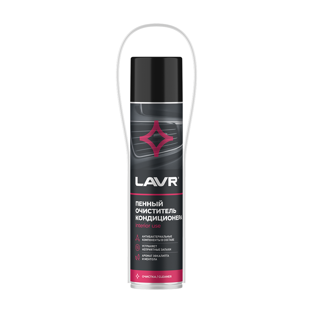 Средство для очистки автомобильной системы кондиционирования, а также для устранения неприятных запахов, освежения и ароматизации системы вентиляции салона автомобиля. Общие Плотная сверхстойкая пена обеспечивает максимальное заполнение всей системы кондиционирования Эффективно очищает загрязнения любой сложности, обеспечивая приток свежего воздуха в салон Содержит в составе антибактериальные компоненты Устраняет неприятные запахи, придает аромат ментола и эвкалипта Технические характеристики Тип товара: очиститель Область применения: система кондиционирования Применение: Перед применением тщательно встряхнуть! Определить местонахождение дренажной трубки слива конденсата из кондиционера. Вставить шланг-удлинитель в дренажную трубку до упора. Удерживая баллон в вертикальном положении, нажать на клапан и выпустить всю пену из баллона, постепенно извлекая шланг. Вынуть шланг-удлинитель из дренажной трубки и подставить под нее емкость для слива загрязнений. После воздействия пены жидкость вытечет из испарителя в емкость. Запустить двигатель и включить режим кондиционирования и рециркуляции, выставив интенсивность обдува в положение «максимум». Дать поработать системе в течение 10 минут при закрытых дверях. Запрещено находиться в салоне! Проветрить салон.