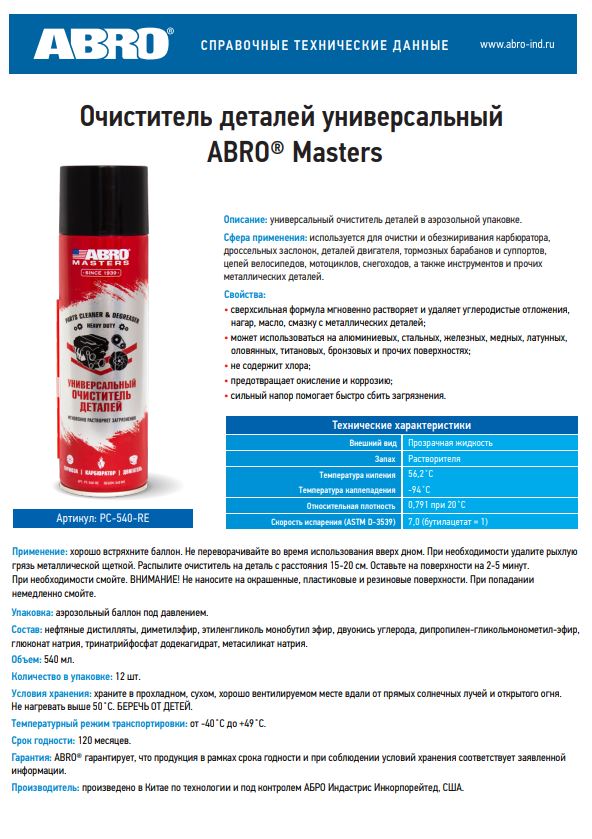 Очиститель деталей ABRO MASTERS PC-540-RE универсальный, 540мл