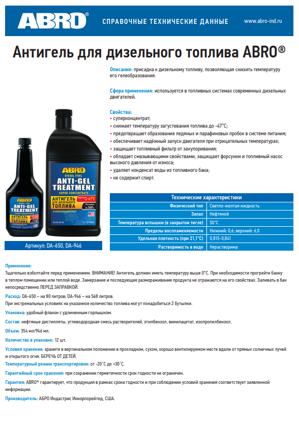 ABRO Антигель для дизельного топлива концентрат DA-946 964 мл Описание: присадка к дизельному топливу, позволяющая снизить температуру его гелеобразования. Сфера применения: используется в топливных системах современных дизельных двигателей. Свойства:  • суперконцентрат;  • снижает температуру загустевания топлива до -47°С;  • предотвращает образование ледяных и парафиновых пробок в топливной системе дизельного двигателя; • обеспечивает надёжный запуск двигателя при отрицательных температурах;  • защищает топливный фильтр от закупоривания;  • обладает смазывающими свойствами, защищает форсунки и топливный насос высокого давления от износа;  • удаляет конденсат воды из топливного бака;  • не содержит спирт. Применение Тщательно взболтайте перед применением. ВНИМАНИЕ! Антигель должен иметь температуру выше 0°С. При необходимости прогрейте банку в теплом помещении или теплой воде. Замерзание и последующее размораживание продукта не отражаются на его свойствах. Заливать в бак непосредственно ПЕРЕД ЗАПРАВКОЙ. Расход: бутылка на 568 литров. При экстремальных условиях на указанное количество топлива могут понадобиться 2 бутылки. Не содержит спиртов. Состав: нефтяные дистилляты, углеводородная смесь растворителей, этилбензол, винилацетат, изопропилбензол.
