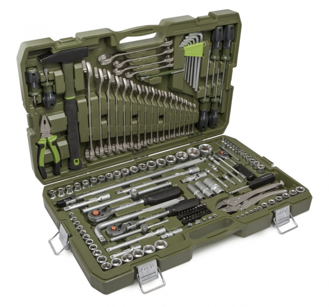 Набор включает в себя инструмент с присоединительным квадратом на 1/4”, 3/8”, 1/2”, что обеспечивает взаимозаменяемость головок и приводов любого из профилей. Таким образом увеличивается количество возможных вариантов подбора требуемой головки с учётом расположения крепежа и выбора привода необходимого размера. Набор инструментов 147 предметов в чемодане подходит для ремонта автомобиля, мотоцикла и другой техники в гараже, мастерской, поездке или автопутешествии. Размеры кейса: 600×380×85 мм Вес: 15,5 кг Особенности набора: — Пять переходников для полной взаимозаменяемости присоединительных квадратов — Шарнирная трещотка 3/8" для удобной работы в ограниченном пространстве — Торцевые головки 3/8'' с 12-гранным рабочим профилем — Разрезные ключи для работы с гидравлическими системами — Молоток 500 граммов с фиберглассовой рукояткой — 1/2” шарнирный удлиненный вороток 430 мм — Яркие накладки обозначают крышку кейса — Четыре усиленных замка и усовершенствованная система крепления петель. Комплектация набора инструментов: Молоток: 500 г Пассатижи: 180 мм Зажим с фиксацией: 220 мм Ключи комбинированные:    6, 7, 8, 9, 10, 11, 12, 13, 14, 15, 16, 17, 18, 19, 21, 22, 24 мм Ключи разрезные: 8×10, 11×13, 12×14, 17×19 мм Ключи шестигранные L-образные: 2,5; 3; 4; 5; 6; 8; 10 мм Головки шестигранные 1/4": 4; 4,5; 5; 5,5; 6; 7; 8; 9; 10; 11; 12; 13; 14 мм Головки Torx 1/4": E4, E5, E6, E7, E8, E10 Вставки 1/4": Шлиц: SL4; SL5,5; SL7     Крест: PH0, PH1, PH2, PH3 Шестигранник: H3, H4, H5, H6, H7, H8, H10 Torx с отверстием: TH10, TH15, TH20, TH25, TH27, TH30 Вороток Т-образный 1/4": 115 мм Трещотка 1/4": 150 мм (45 зубцов) Рукоятка 1/4": 150 мм Удлинители 1/4": 50, 100, 150 мм Удлинитель гибкий 1/4": 150 мм Кардан 1/4": 45 мм Держатель для бит 1/4":    1/4"F x 1/4"F Переходник: 1/4"F x 3/8"M Головки двенадцатигранные 3/8": 6, 7, 8, 9, 10, 11, 12, 13, 14, 15, 16, 17, 18, 19, 21, 22 мм           - Головка свечная 3/8": 14 мм Вороток Т-образный 3/8": 150 мм Трещотка шарнирная 3/8": 200 мм (45 зубцов) Удлинители 3/8": 75, 150 мм Кардан 3/8": 60 мм Переходники: 3/8"F x 1/4"M, 3/8"F x 1/2"M Головки шестигранные 1/2": 8, 9, 10, 11, 12, 13, 14, 15, 16, 17, 18, 19, 21, 22, 24, 27, 30, 32 мм Головки свечные 1/2": 16, 21 мм Головки Torx 1/2": E10, E12, E14, E16, E18, E20 Вороток Т-образный 1/2": 250 мм Вороток L-образный 1/2": 250 мм Вороток шарнирный 1/2": 430 мм Трещотка 1/2": 250 мм (45 зубцов) Удлинители 1/2" : 125, 250 мм Кардан 1/2": 80 мм Переходник: 1/2"F х 3/8"M Отвёртки:     Шлиц    SL5 × 38 мм, SL5 × 100 мм, SL6,5 × 150 мм Крест    PH1 × 100 мм, PH2 × 38 мм, PH2 × 150 мм Магнит телескопический:    2,7 кг