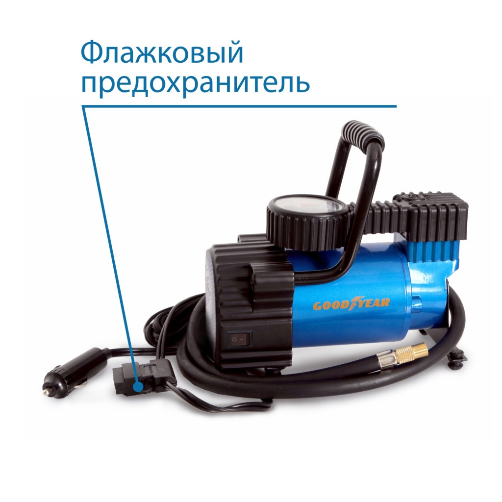 Воздушный автомобильный компрессор Goodyear  – оригинальный лицензионный продукт высокого качества, незаменимый помощник в дороге для любого автолюбителя. Применяемость: Устройство предназначено для накачивания автомобильных и велосипедных шин, резиновых лодок, мячей, матрасов. Особенности: Накачивает колесо R-16 за 5 минут. Оригинальный лицензированный продукт. Устройство имеет увеличенное время беспрерывной эксплуатации. Питание компрессора осуществляется через гнездо прикуривателя. Продукт имеет увеличенный срок гарантийного обслуживания, который составляет 3 года Высокоточный манометр обеспечивает минимальную погрешность измерений не более 5%. Корпус и поршневая группа компрессора  сделаны из металла, что обеспечивает повышенную прочность и увеличенный ресурс. В комплект входит набор насадок-переходников, который делает компрессор универсальным в использовании. Прочная сумка из износостойкого материала позволяет компактно хранить компрессор в багажнике и удобно его переносить. Флажковый предохранитель защищает электрическую цепь автомобиля и компрессора от скачков напряжения.